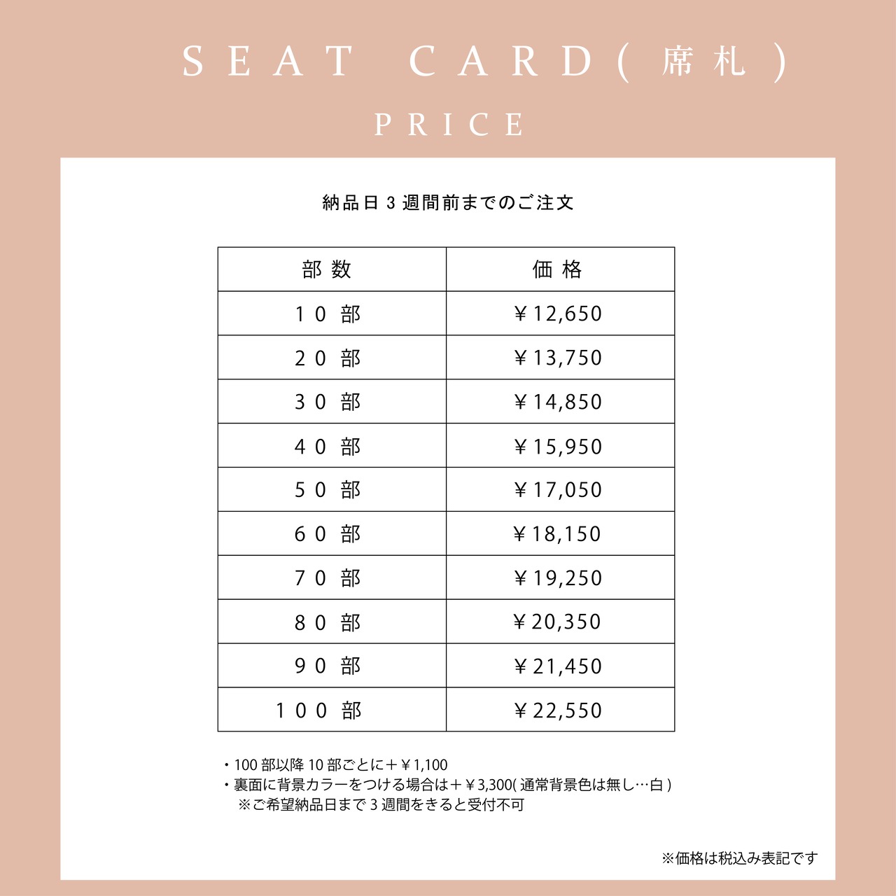 ゲスト名簿ご提出後、印刷工程へと進ませていただきますので、その後のお名前の誤字脱字等などの変更は不可となっております。入稿後の段階に入ってから修正・増加があった場合は、1〜10部までは一律¥4,400(税込)の料金が追加で必要となりますのでご注意くださいませ。※それ以上の枚数の修正があった場合は個別に対応させていただきます。