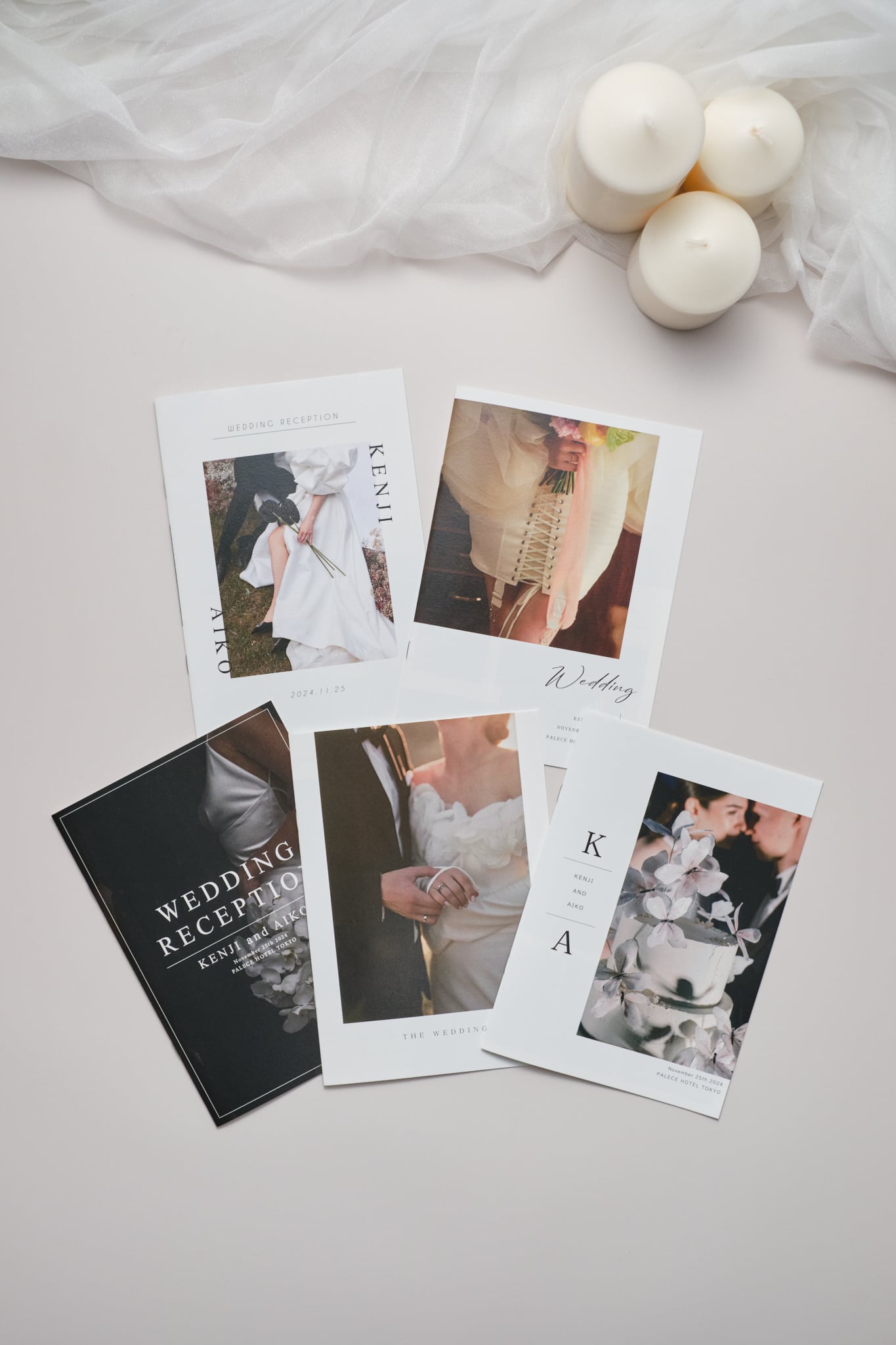 ・8P(1P-表紙 / 2.3P-挨拶 / 4P-プロフィール / 5P-ラブストーリー※メニューに変更可 /6.7P-席次表※Q&A.アルバムに変更可)